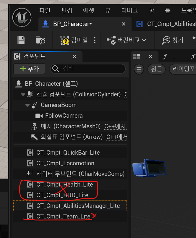 - 무작정 지우면 컴파일 에러가 발생하게 되므로 레퍼런스 찾기 기능을 이용해 사용되고 있는 부분들을 찾아서 손수 제거해주고 그럼에도 불구하고 컴파일 에러가 발생하는 부분들을 찾아서 수정해 코드를 수정해 니다.