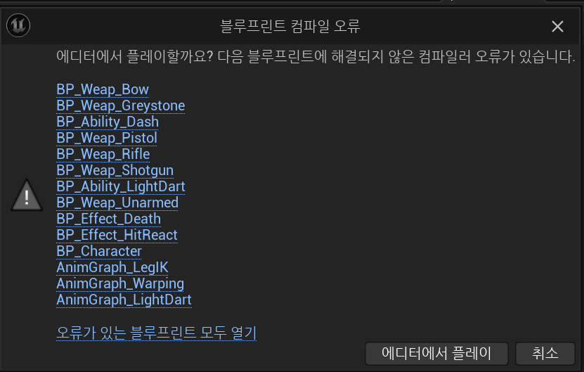 - 오류가 있는 블루프린트 모두 열기를 실행하고, UE4 부분을 제거시켜줍니다. 특히 Anim BP의 Blend Poses에서 에러가 발생하게 되면 노드를 새로 연결해줘야 하므로 이 부분을 유념합시다.