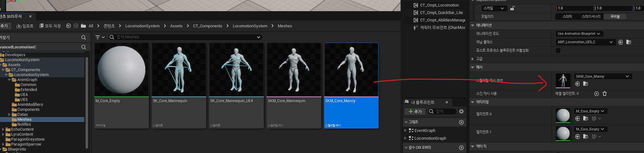 - 스켈레탈 메시와 애님 BP도 굳이 Child를 써서 복잡성을 늘릴필요가 없어 메인 스켈레탈로 쓰이는 Core 메시를 사용하고 애님 BP도 메인으로 사용하여 복잡성을 낮춘다.