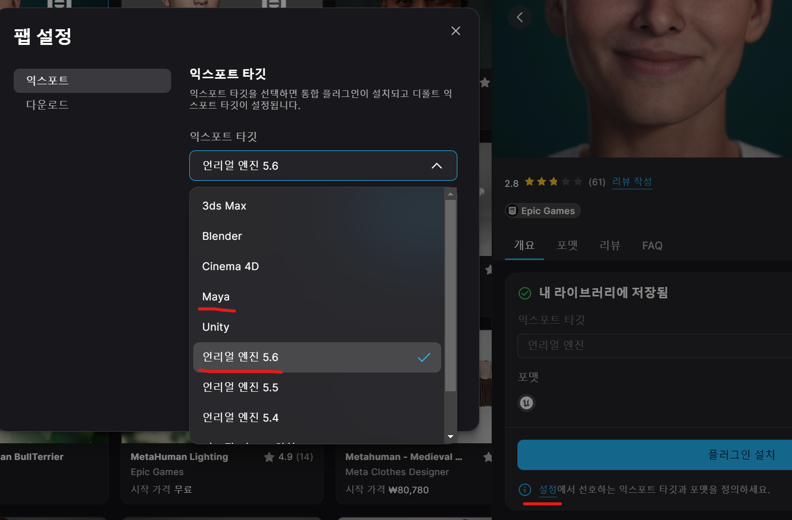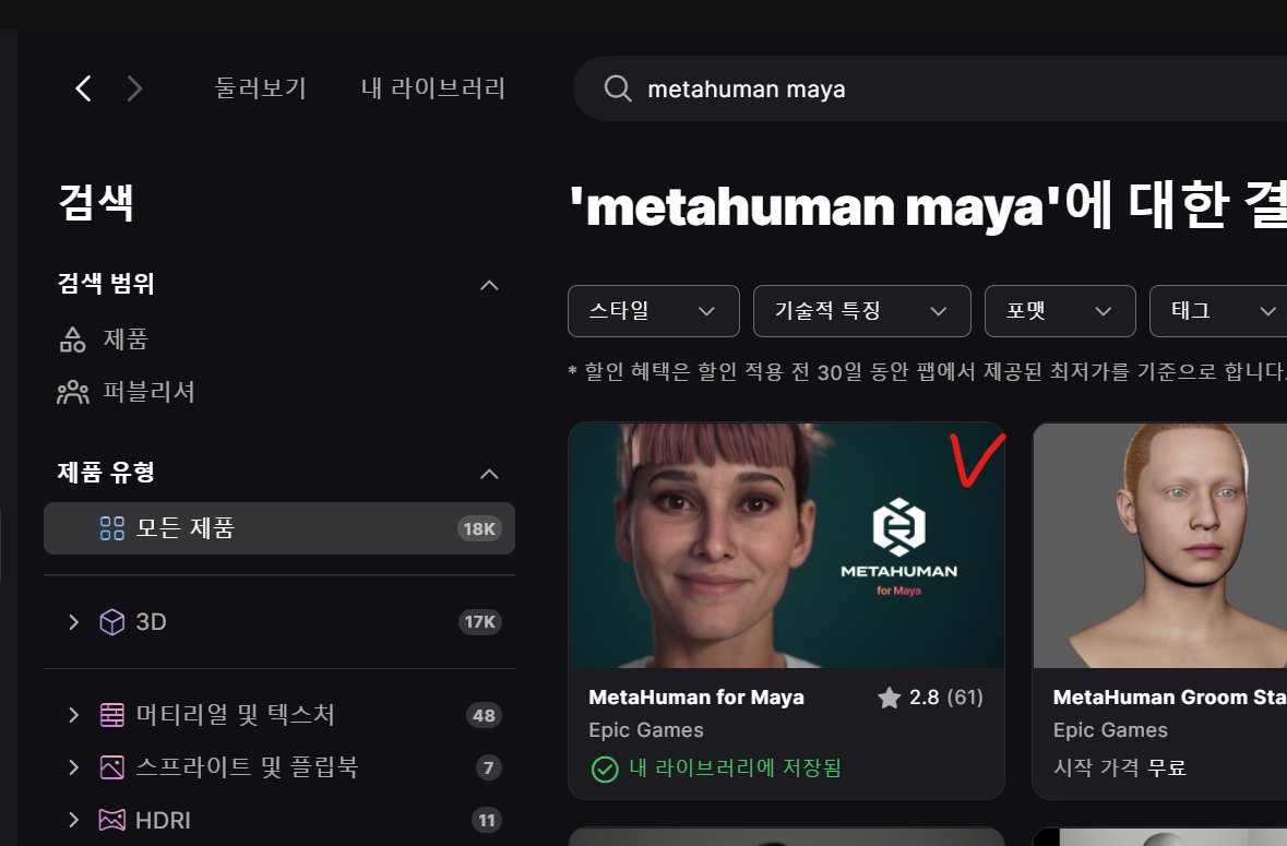 - Fab에서 메타휴먼 마야를 검색하여 설치하기.